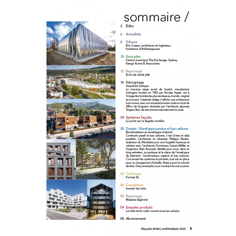 Non je ne vous infligerais pas un énième édito sur la Covid-19 et le “monde d’après”… Sachez seulement qu’à notre échelle, nous avons tout mis en oeuvre et continuons à le faire pour vous apporter une information technique et architecturale de qualité. Et ce numéro concocté à la maison, ne déroge pas à la règle. En ouverture du dossier consacré à l’enveloppe passive et bas carbonne sujet ô combien essentiel pour tenter d’amoindrir la crise climatique, autrement plus forte et longue interview de Philippe Madec. Un architecte engagé bien avant la crise sanitaire dans la frugalité heureuse et climatique. Autre voix qui compte : l’architecture et ingénieur Eric Cassar qui nous livre, dans une tribune sensible son regard sur le monde… d’aujourd’hui. La rubrique Décryptage, quant à elle, vous emmènera dans le canton du Jure, en Suisse, à la découverte de l’univers feutré des manufactures horlogères et du nouveau siège social de Swatch et d’Omega. Un projet spectaculaire et environnemental conçu par l’architecte japonais de renommée internationale., Shigeru Ban, lauréat du prix Pritzker d’architecture 2014. De quoi se donner du baume au coeur pour un reprise que je vous souhaite heureuse et créative, sans être trop frugale sauf sur le plan carbonne, cela va de soi.