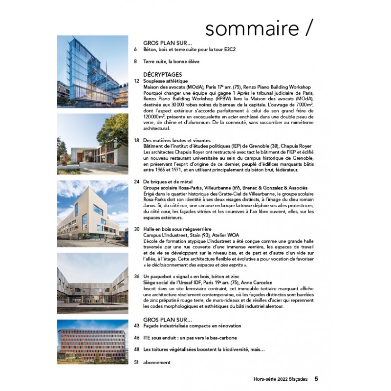 Dans ce numéro spécial “Hors-série 2022” de 5façades vous retrouvez cinq projets représentatifs du patrimoine du 21ème siècle. Car oui, ce sont ces projets emblématiques qui construisent notre patrimoine, aussi bien par leur architecture que par leur enveloppe. Ces dernières, esthétiques, performantes, pérennes et au service des occupants qu’elles protègent, s’imposent durablement comme la signature d’une exigence architecturale qui avance avec son temps. Ces bâtiments nous montrent aussi à quel point la diversité de ces systèmes façades et couvertures, développés par les industriels, les mettent en valeur. Et au-delà du talent de l’architecte, il y a celui des bureaux d’études façades, des façadiers et de leurs compagnons : sans eux, rien n’est possible, c’est ce que met en avant la série des cinq gros plans sélectionnés. Le numéro que vous avez en main salue tous ces savoir-faire du 21ème siècle.