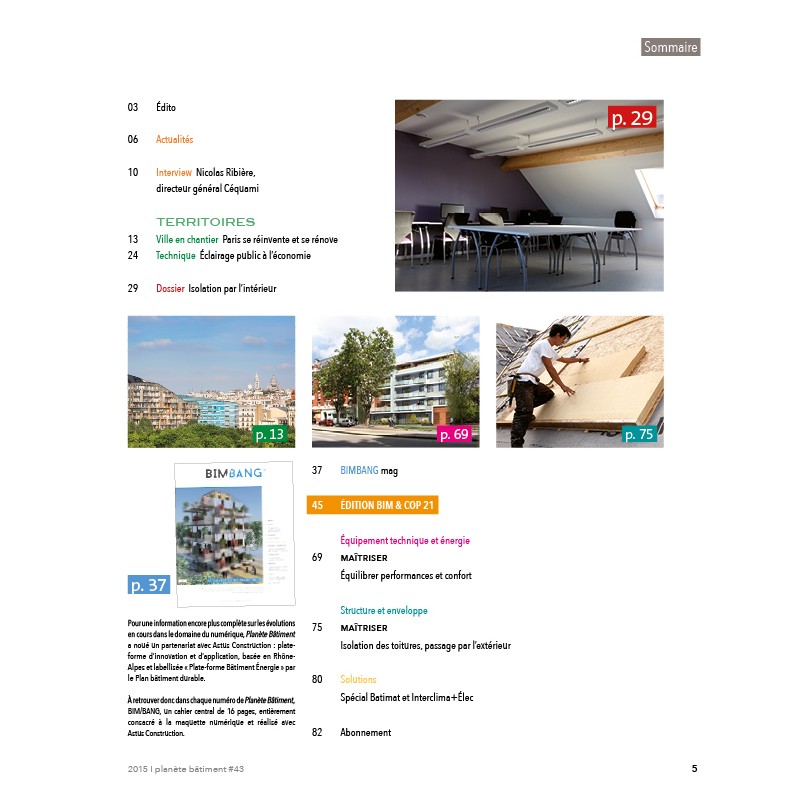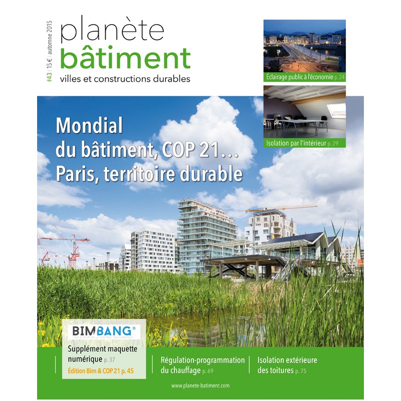 Dans le secteur qui nous intéresse, ville et construction durable, les mois de novembre et décembre 2015 auront une résonnance particulière. D’abord le Mondial du Bâtiment avec lequel les acteurs du secteur ont tois salons en un – Batimat, Interclima+Élec et Ideobain – pour s’informer sur les nouvelles solutions techniques qui s’offrent à eux. Gageons que, malgré la morosité ambiante, les défections de quelques grands acteurs industriels, nous y parlerons beaucoup d’efficacité et de transition qu’elle soit numérique ou énergétique. Autre événement : Cop 21. Là on sera davantage politique que technique, mais au centre des préoccupations environnementales mondiales dont chacun connaît aujourd’hui les enjeux.